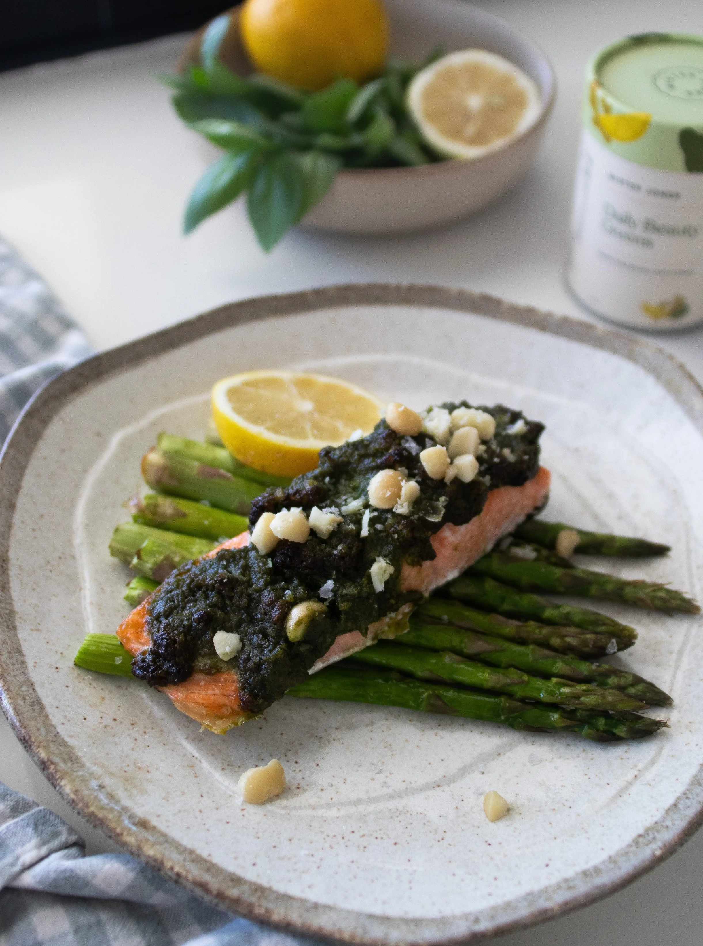 Wild-caught salmon is an excellent source of essential fatty acids, which help maintain skin hydration, reduce inflammation, and support a healthy gut lining. The creamy macadamia pesto is loaded with vitamin E and monounsaturated fats— key nutrients for skin elasticity and cell repair. Paired with fibre-rich asparagus for prebiotic support, this dish is a delicious way to nourish your body inside and out.